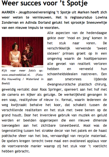 De jeugdleden van de Marker toneelvereniging voeren het moderne sprookje, geschreven door Adinda Dorland, Jongejaap Zeeman en Lowina Zondervan, mooi uit. In het begin nog een beetje onwennig, maar dat verdwijnt snel, mede door het standvastige spel van enkele hoofdrolspelers. Zo staat Mario Boes, als de koning, gelijk stevig achter de kinderwagen. Isabel Springer mag als stiefmoeder heerlijk kijven met Jamila Kehinde, die als Sneeuwwitje even hard schreeuwt en pest. De smetvrezige chirurg Roderick is een prachtrol van Rosalien Springer, die hem een bijzonder uitgestreken gezicht en stijve houding geeft.